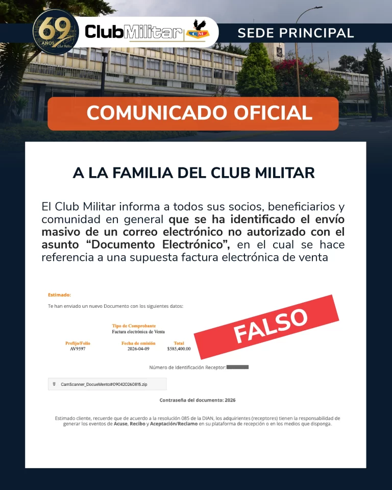 Bogotá, Colombia. El Club Militar informó a sus socios, beneficiarios y comunidad en general sobre la circulación de un correo electrónico no autorizado con el asunto “Documento Electrónico”, en el que se hace referencia a una supuesta factura electrónica de venta