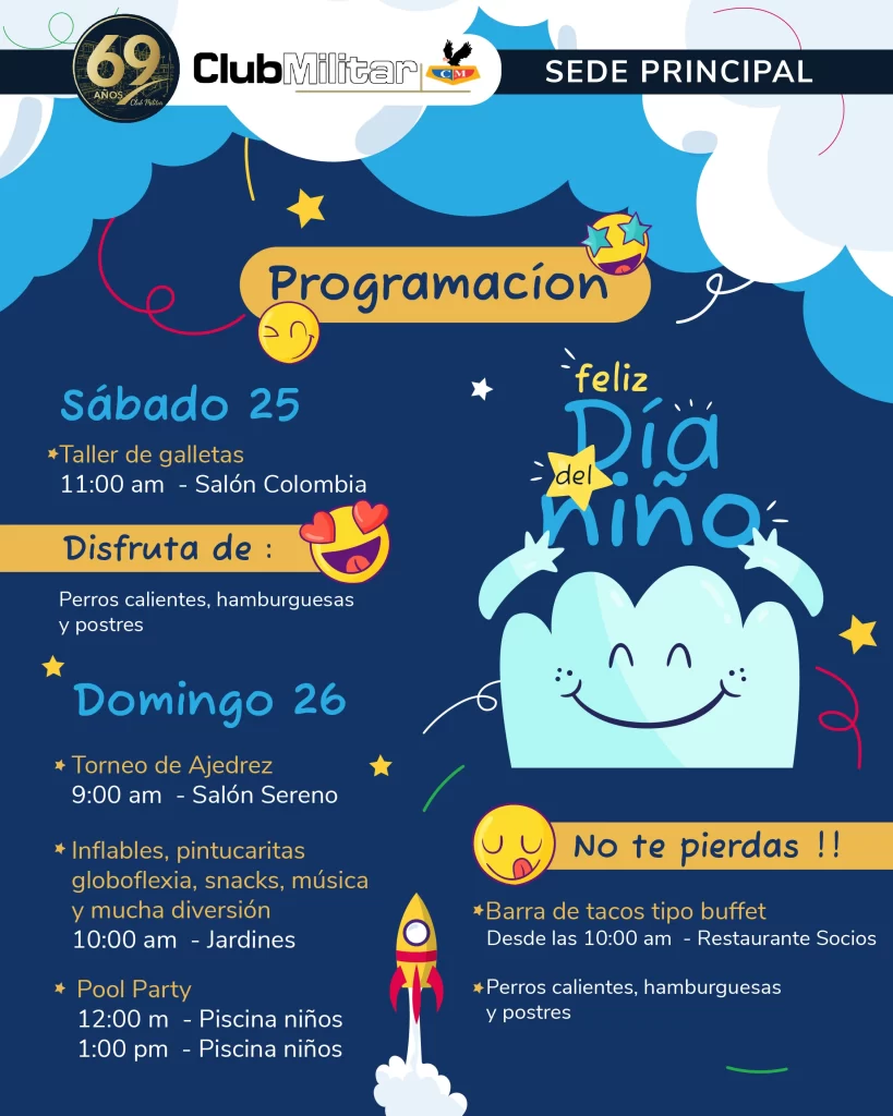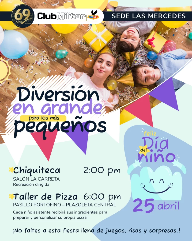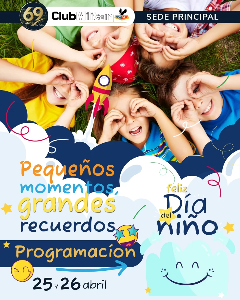 El Club Militar se llena de color, juegos y sonrisas para celebrar una de las fechas más especiales del año: el Día del Niño. Este 26 de abril, en nuestra Sede Principal, te invitamos a disfrutar de una jornada inolvidable con actividades recreativas, espectáculos, premios y muchas sorpresas pensadas especialmente para nuestros pequeños héroes.